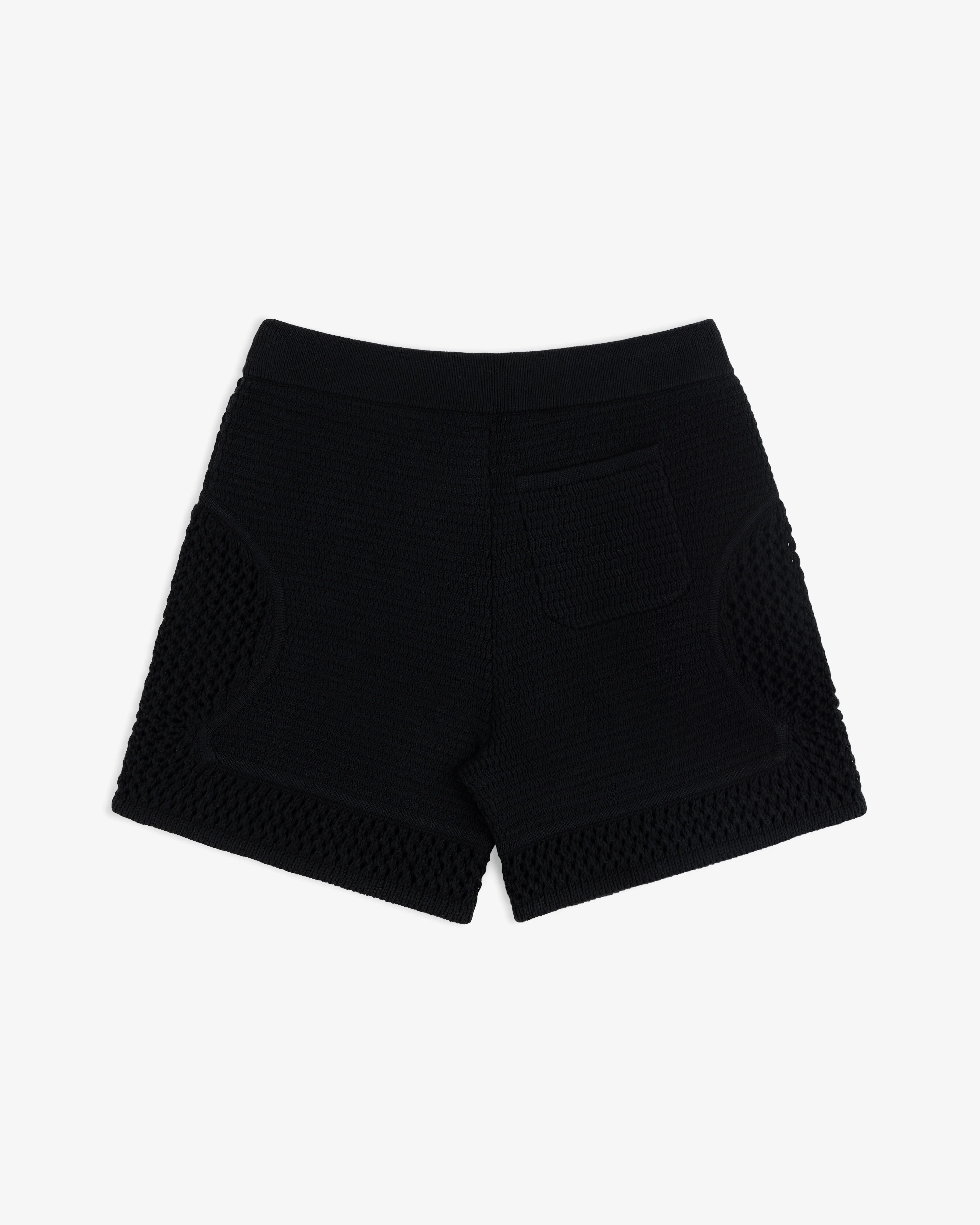 • Black knit shorts• Mesh stitched panels at sides• Ribbed elasticated waist with flat knit drawstrings• One patch pocket at back• Regular fit• 100% Cotton• Dry clean• Made in China