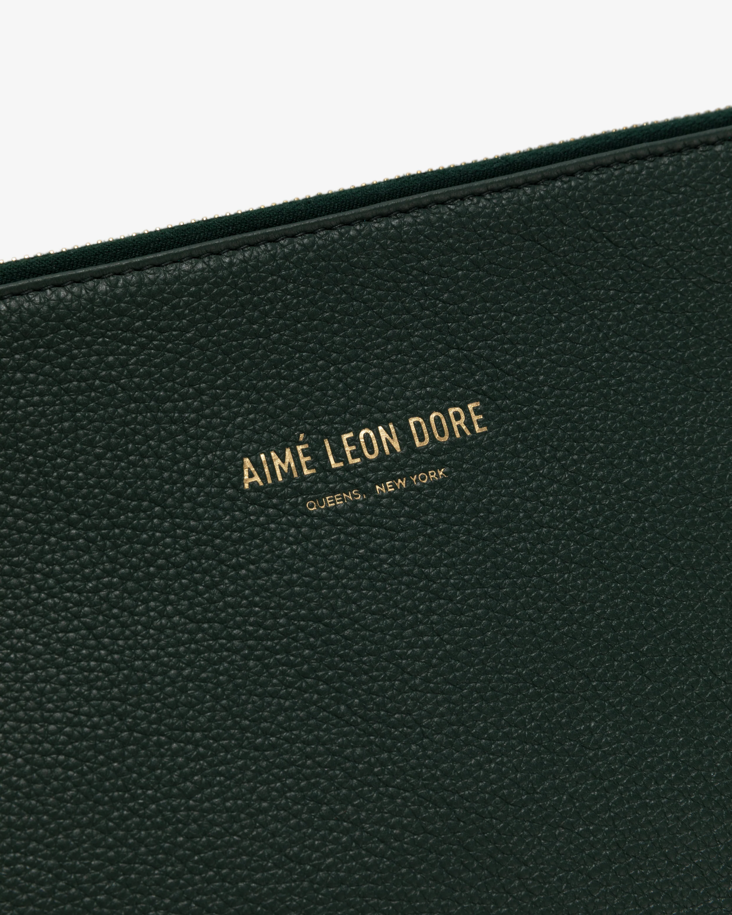 • Green pouch• Genuine leather• Gold foil debossed logo at front• Gold zipper with leather pull• Hardware: Zamac & Brass• Body: 100% Calf Leather• Lining: 100% Goat Suede• Wipe clean• Made in Spain