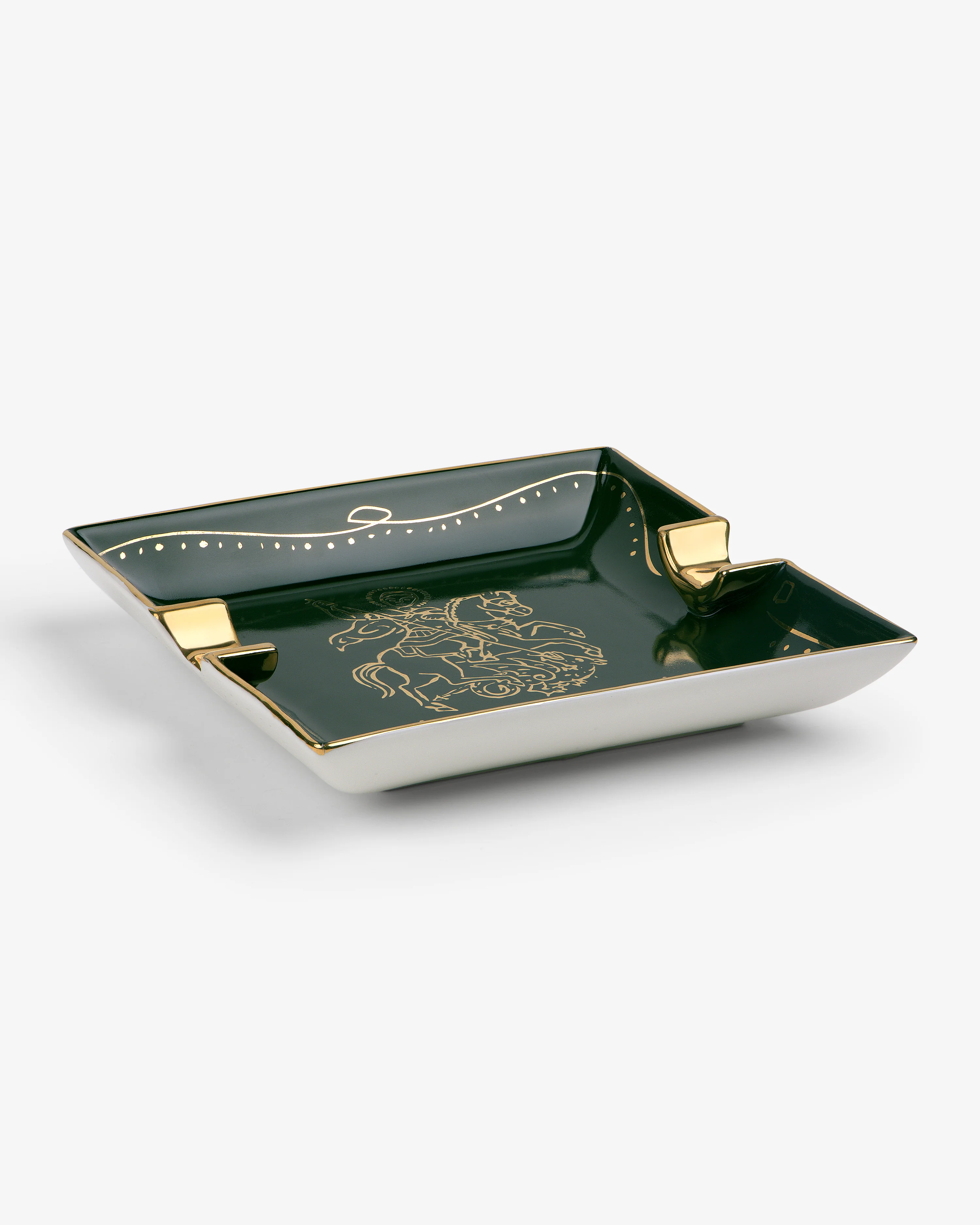 • Green ashtray• Gold Saint George artwork at face• Gold foil logo & rim• Printed logo at bottom• 100% Porcelain• Hand wash• Made in Thailand
