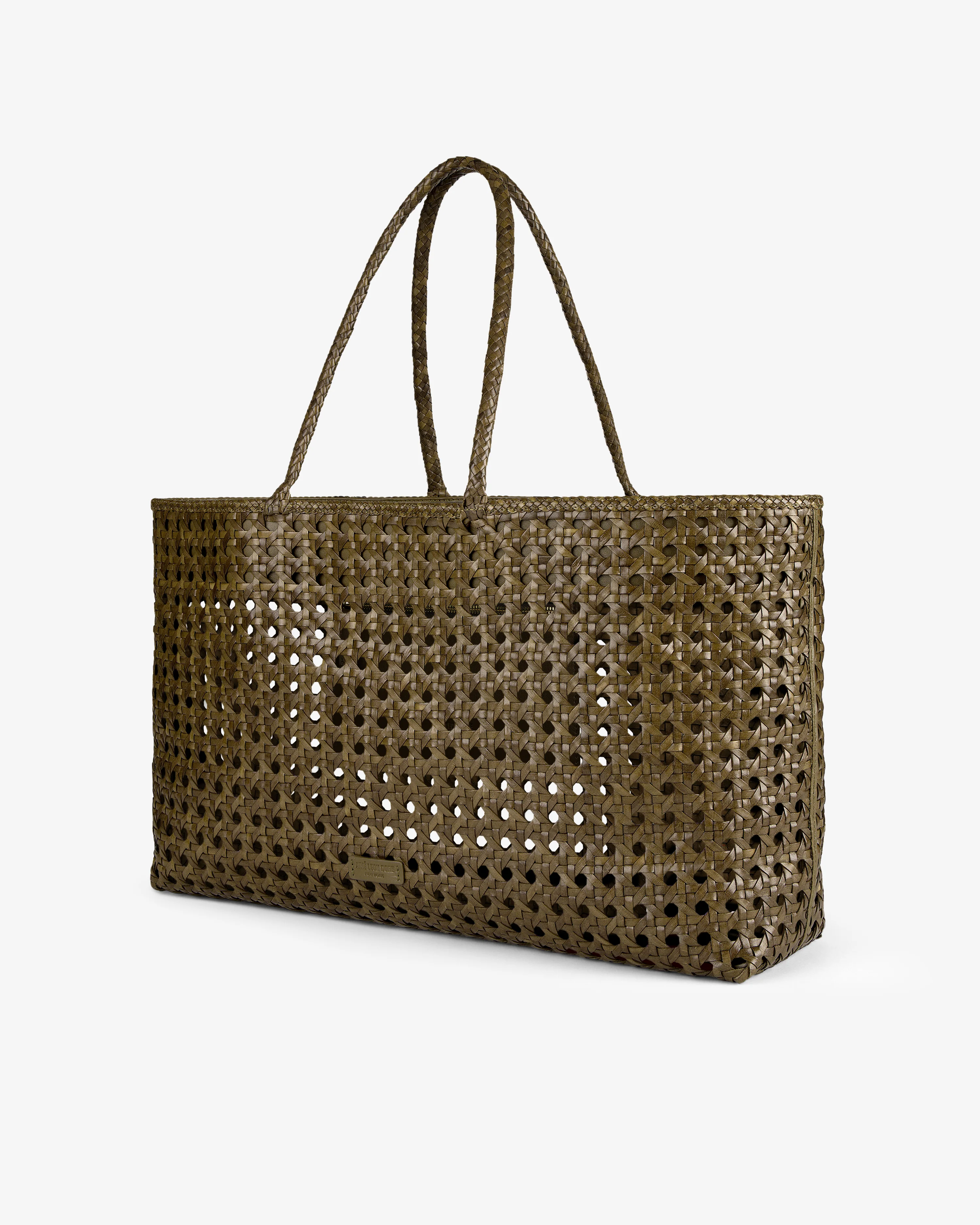 • Olive tote• Caning weave buffalo leather• Debossed logo at front• Large main compartment with one interior zipper pocket• Braided straps• 100% Buffalo Leather• Clean with soft dry cloth. Gently blot any liquid spills. If necessary, use a neutral leather cleaner or conditioner designed for aniline leathers. Avoid excessive exposure to sunlight, moisture, & heat. Store in a cool, dry place.• Made in India